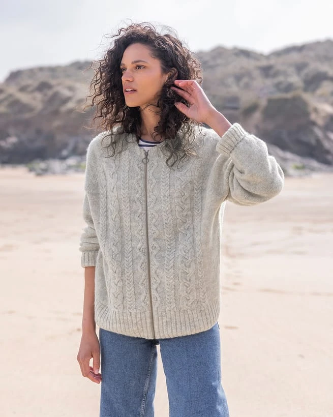 We’re proud to say that from farm to factory, our Cable Zip Cardigan is produced entirely in the UK! The colour way of this cardigan is totally natural as no dyestuffs were used in the process of creating the yarn. Natural fibres allow your skin to breathe whilst keeping you warm in winter. Details include cabling running down the body, a crew neck, ribbed cuffs, collar and hem and a metal zip down the centre.