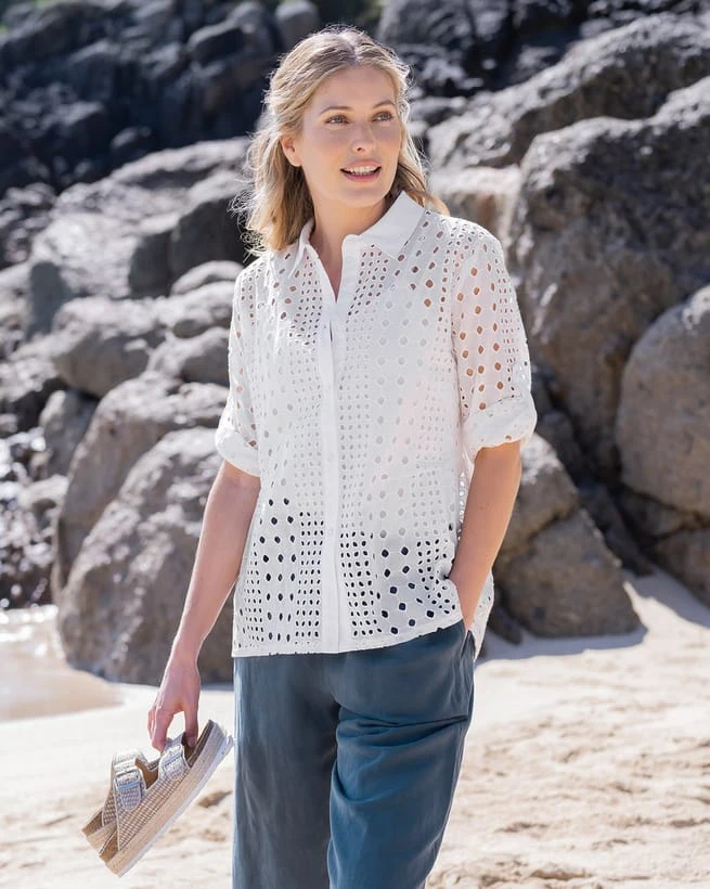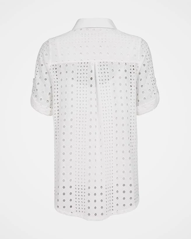 This beautiful shirt is made from feminine broderie cutwork fabric which creates a sheer outer-layer. Lined with a soft cotton cami, the collar and placket are also constructed from contrast cotton. The high-low hem detail and inverted box pleat at the back yoke seam create a full back with a striking look.
