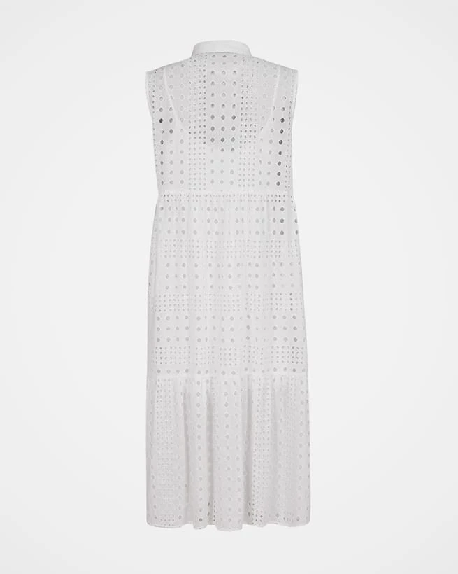 Perfectly on trend, our beautiful Broderie Sleeveless Maxi Dress has a flowing, tiered silhouette and a gathered waist. The broderie cutwork fabric of the outer layer creates a sheer appearance, and the dress is lined with a shorter cotton cami dress. The collar and placket are made in plain contrast cotton.