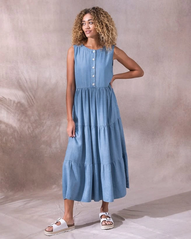 A simple and elegant tiered midi dress that offers a relaxed and comfy fit with a generous, draped skirt. Featuring contrast buttons that add bodice detail, a crew neckline and pockets in the side seam.