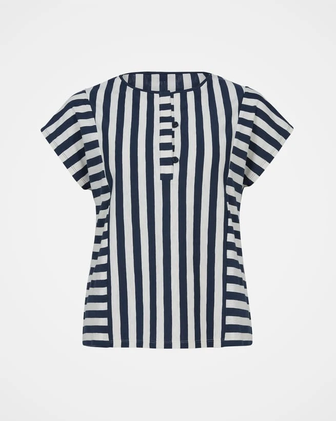 This top offers a relaxed fit through its boxy shape and soft, slub jersey composition. A modern take on nautical stripes, with it’s cut about design in navy and ecru. Featuring a half placket with Corozo buttons and loops, binding on the neckline and grown-on short sleeves.