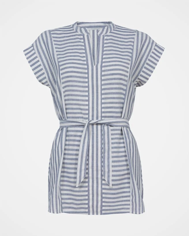 The Cutabout Stripe Tunic has an effortless, loose fit that can be pulled in at the waist for a more fitted look. The natural fabric feels soft on skin and breathable. The notch neck detail is complimented by a small stand collar, and grown on sleeves add slight coverage. Finishing below the hip, this top pairs perfectly with our Celt Shorts and Celt Pants.