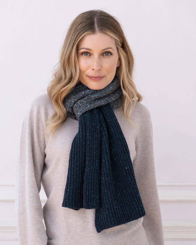When it comes to Donegal wool, only the real thing will do. This unisex scarf is designed to accentuate the famous yarn’s characterful flecking with a colour-block detail and a simple ribbed structure. Crafted in Britain, it has a warm and cosy feel that’s sure to make it a firm favourite this winter (and beyond).