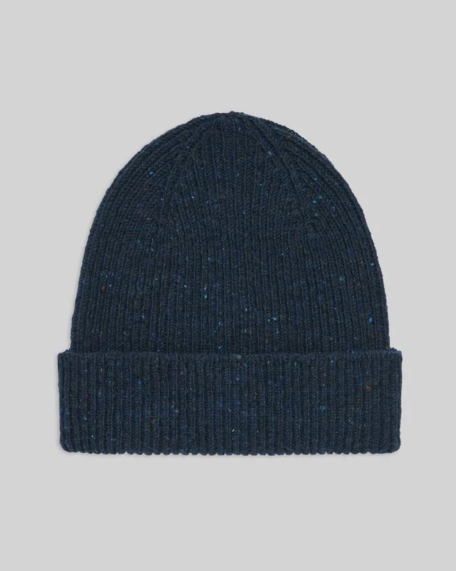 The combination of our Donegal wool and a chunky rib stitch is a match made in winter-accessory heaven! The simple structure really highlights the yarn’s characterful flecks and pops of colour, but the overall effect is still understated enough that you can wear this beanie with anything and everything. Knitted in Britain, it’s finished with a turnback for extra cosiness.