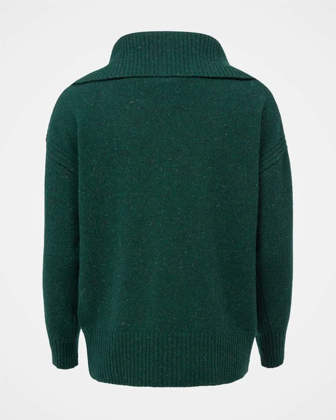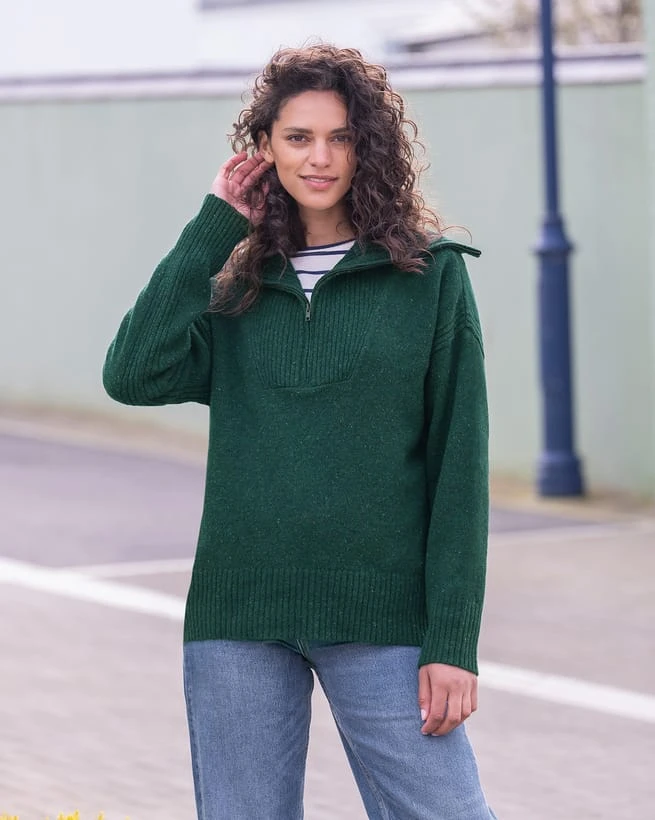 The chunky metal zip at the ribbed collar is a statement feature on this easy fit, drop shoulder sweater. Ribbed fashioning on the armholes and down the side seams matches the deep ribbed cuff and hem, and the plain knit of the body and sleeves allows the beautifully flecked yarn to speak for itself. Wear with denim and trainers for an effortlessly cool appearance.