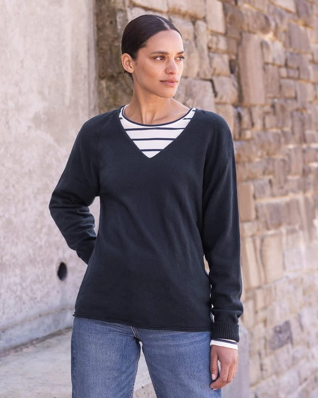 Cut to a slouchy shape, our core Geelong jumper style has been updated with a clean v-neckline for more versatility and wearability throughout the seasons. Featuring ribbed cuffs and our signature cast-off rolled hem. With a loose fit this is perfect for layering over shirts, wear this classic jumper at home, to work, or out and about on the weekend.