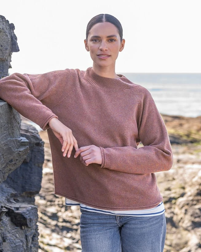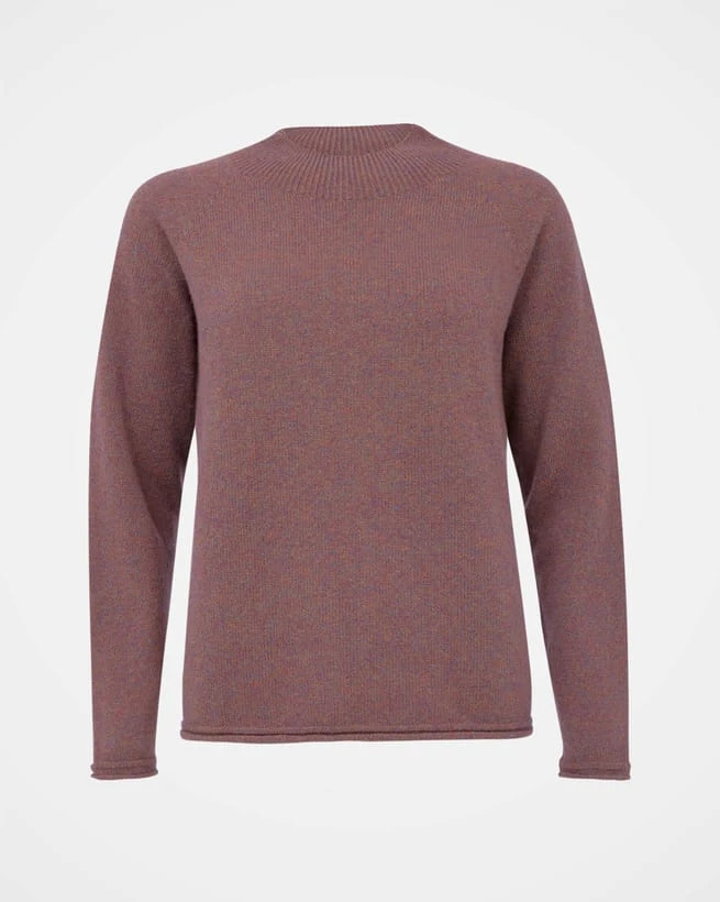 This loose fitting, mid-weight, boxy jumper has been knitted using a special seamless, whole garment technique. Using super soft yarn in a beautiful melange of berry shades with touches of blue and gold, you’ll be reaching for it all season long. Details include raglan sleeves, our signature rolled and cast off hem and cuffs, plus a fine rib, grown on low funnel neck collar.