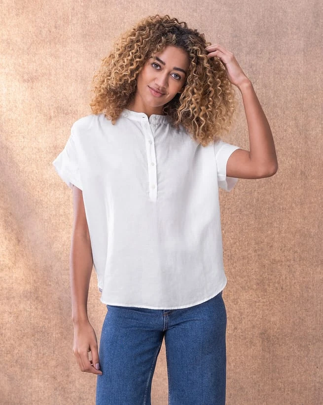 With it’s small stand collar and buttoned half placket, this blouse is made from a light, crisp material that is soft and comfortable. The boxy fit and curved hem is complimented by grown on sleeves and soft gathering at the front and back yoke.