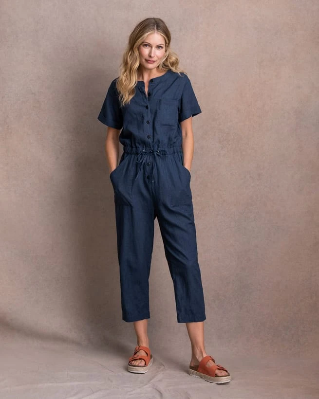 Our Linen/Cotton Jumpsuit has a sophisticated look whilst still feeling incredibly comfortable and relaxed. The pulled in, elasticated waist gives some definition, and the adjustable tie allows you to style this outfit however you like. Soft and breathable, the fabric has a subtle micro check pattern running through it, adding interest and texture.