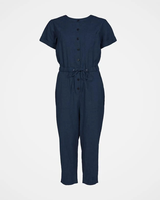 Featuring laid on hip pockets and back patch pockets. The jumpsuit has a button through bodice, peg leg shape trousers, short sleeves and turn up cuff hems.