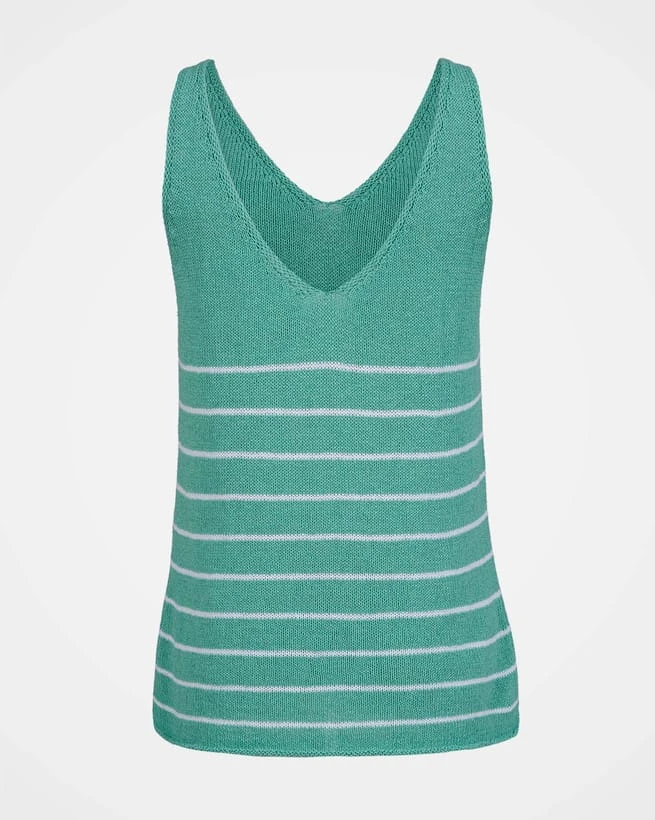 This summery, knitted, vest style top should be worn with shorts and skirts throughout the warmer months. In a fun, holiday colour with stripe detail across the torso and v-neckline, the top is a lovely twist on a classic tank.