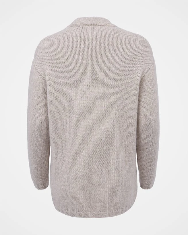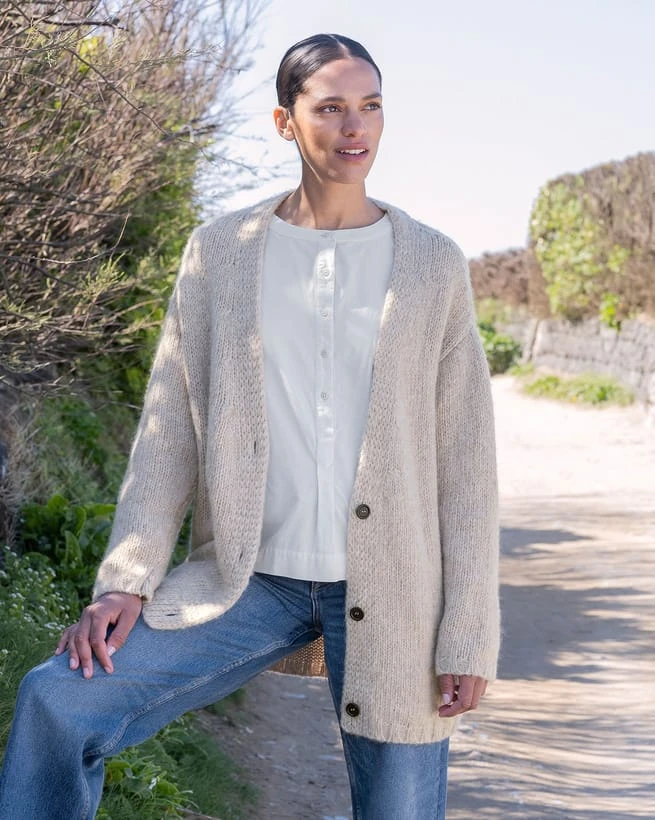 Made from super squishy and lofty yarn, this luxurious cardigan features a touch of alpaca making it incredibly cosy, and virgin wool which is breathable and soft. The stylish, slouchy nature of this knit makes it easy to pair with both dresses and jeans, and we’ve designed it to be worn throughout the seasons. Details include a deep v-neckline and natural Corozo buttons.