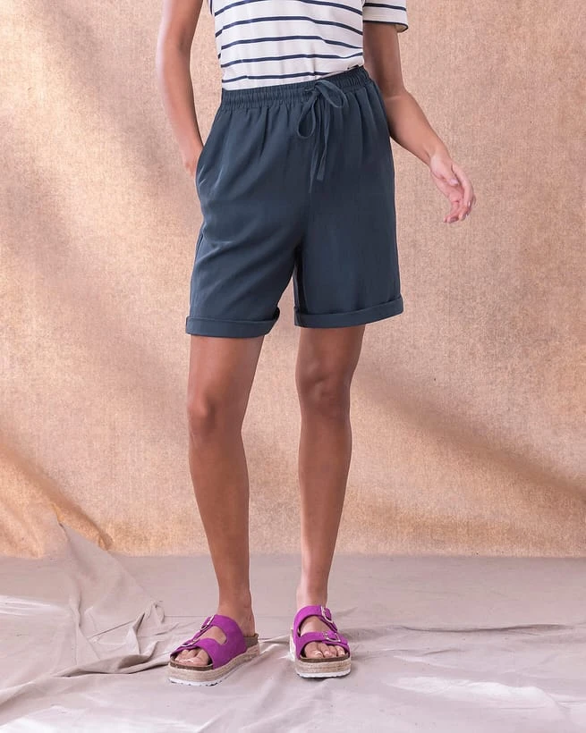 Introducing the short version of our best selling cropped trouser. With an elasticated waist, this loose and flowing short features a self tie for an incredibly comfortable fit. Cut to the low thigh for a flattering length, they feature turn up cuff hems, a wide leg opening, back patch and side angled pockets.