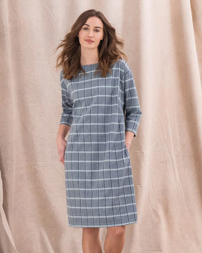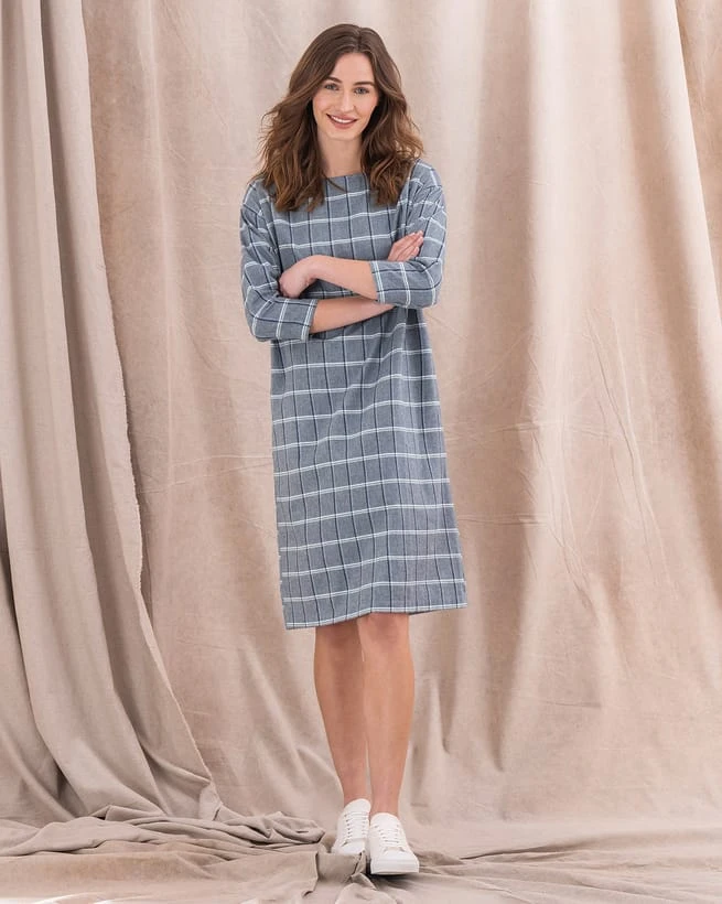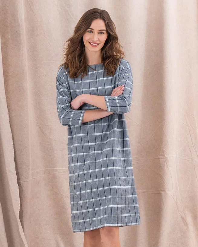 With a loose, relaxed fit and a wonderfully soft flannel finish, this simple, easy shift dress is an all-year-round staple. Not only is it comfortable and casual, but it’s easy to style. Pair with tights and chunky knitwear in the winter, or alone with trainers as the weather improves. Crafted in a light windowpane check fabric, we’ve opted for a slightly wider crew neckline, cropped sleeves, bust darts and pockets in the side seam.