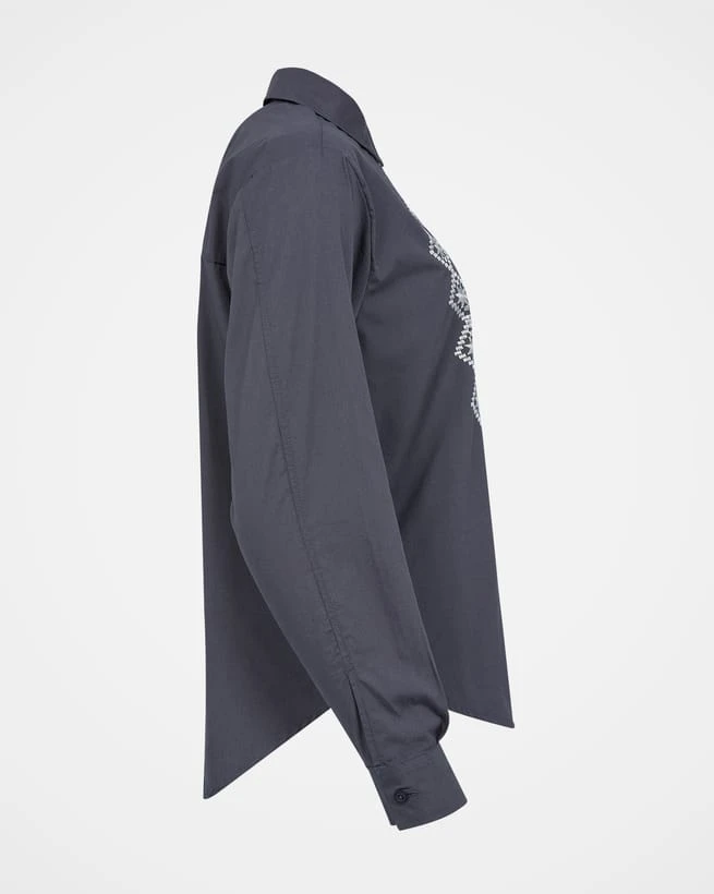 Made in a classic shirt shape, with a collar, shirt sleeves and a button cuff. Contrast embroidery on the front adds detail to this neat blouse. The fabric has a crisp and clean look and feel, whilst being lightweight, making it a smarter option for summer.