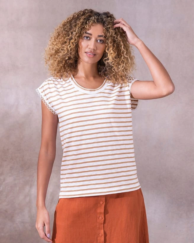 Much more than your everyday t-shirt. This lovely organic cotton scoop neck top is made from soft, slub jersey and features a delicate and subtle cotton loop lace trim insert at the shoulder seam and around the arm hole. Breathable and durable, pull on with jeans or shorts and sneakers for the perfect cool and casual outfit.