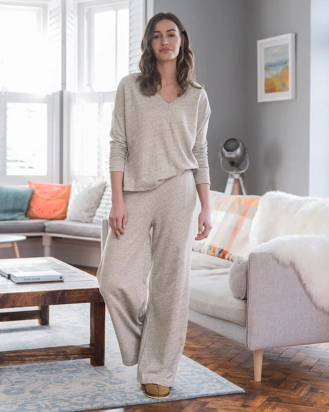 Made from melange, brushed back sweatshirt material, this super cosy jersey V-neck coordinates exactly with our organic cotton wide leg joggers, or can be paired with rest of the lounge collection. Incredibly comfortable, we’ve designed it with a straight cuff and hem so it’s really easy to wear. Long sleeves will keep you warm on winter nights and it looks stylish worn both at home or out and about.