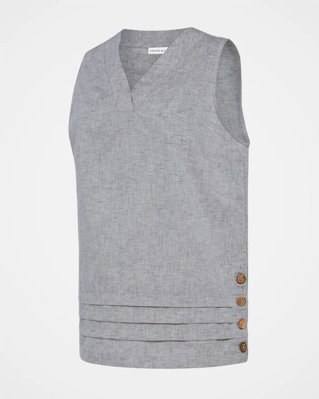 Washed for added softness, the composition of this v-neck top adds structure, texture and interest. It is sleeveless and exceptionally breathable, making it perfect for summer. The flattering straight fit skims the body. You’ll find beautiful detailing at the hem, including pleats and wooden buttons. This versatile top can be worn with pants, skirts and shorts alike.