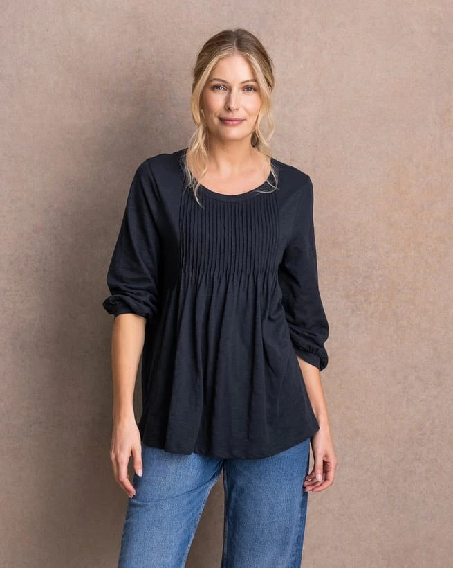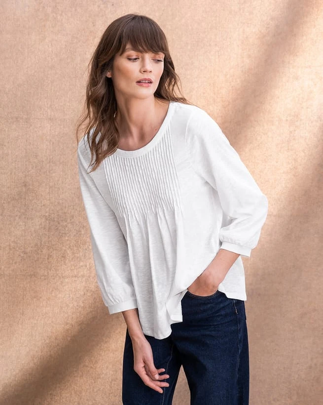 This top features a flattering scoop neckline and 3/4 length sleeves with gathering at the cuff, beautifully crafted from organic soft slub jersey. The pintuck detailling on the front bodice creates a slimmer fit over the bust, whilst flaring out over the hips, making it airy and easy to wear.