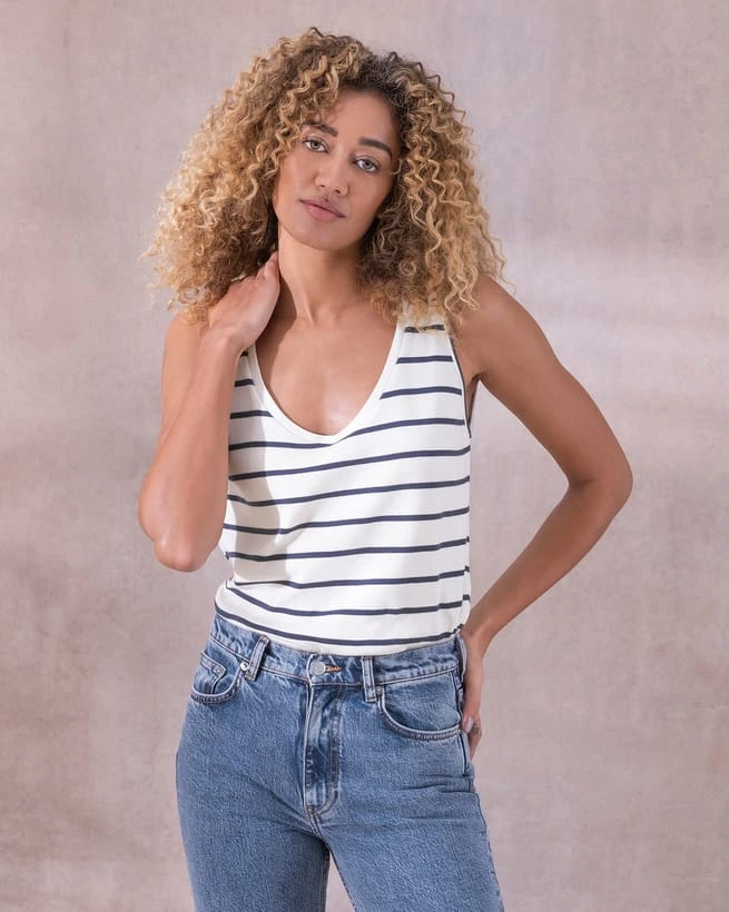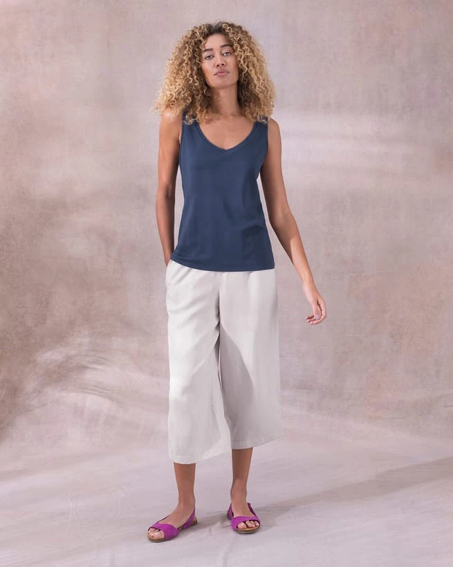 A wardrobe staple, our V-Neck Vest Top features a deep v neckline at both the front and back. Made from organic cotton, the brushed surface adds extra softness. With a slimmer fit, this top can be worn alone or layered, and it pairs well with any outfit. The casual style and cut looks great with both shorts and jeans, and it’s pull-on nature goes hand in hand with it’s wearability.