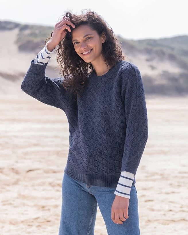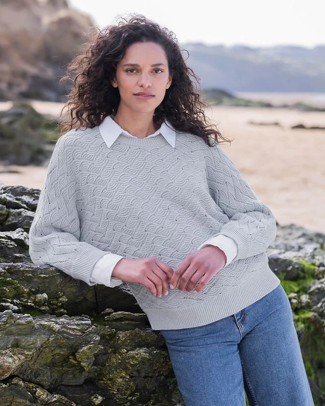 A beautiful, relaxed sweater featuring a crew neckline and a modern take on a batwing, grown-on sleeve. Far more than just a basic knit, it features an intricate wave-style pointelle pattern, that adds texture and substance to the style. Completed with ribbing at the collar, cuff and hem, this sweater looks great over a white linen shirt or paired with our midi skirt.
