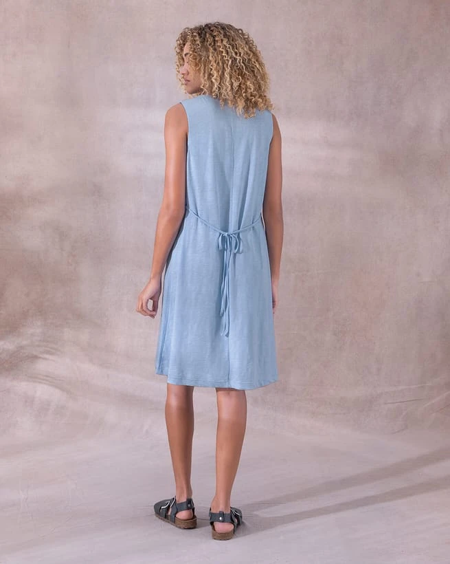 Our knee length Pintuck Jersey Dress is comfortable, light and airy. The slightly textured fabric quality and pintuck detailing adds interest. Sleeveless for summer days, featuring shell buttons, pockets and side ties which can be adjusted to achieve a loose or fitted silhouette. Pair with sandals for a versatile look for all occasions.