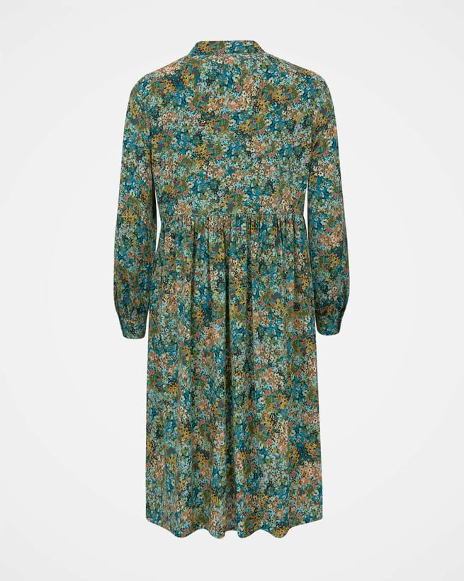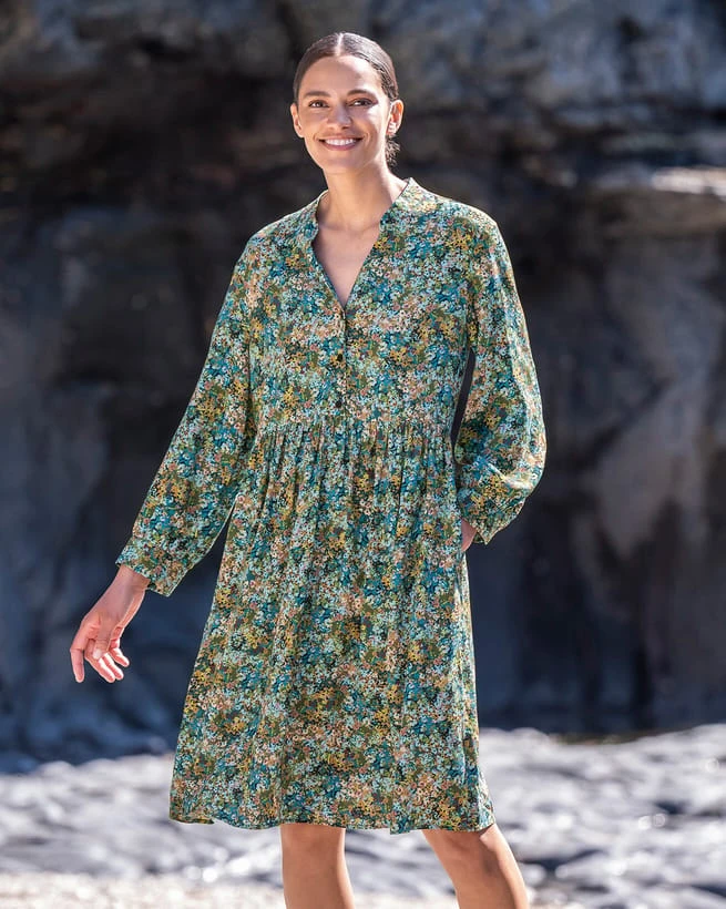 Designed to transition with you through the season, this knee length dress features a small stand collar and a v-neckline. The skirt, which is gathered into the waist seam, is a full, swing shape and has added side pockets. An easy fit, details include button placket to the waist seam and long sleeves finishing in pretty shirt cuffs.