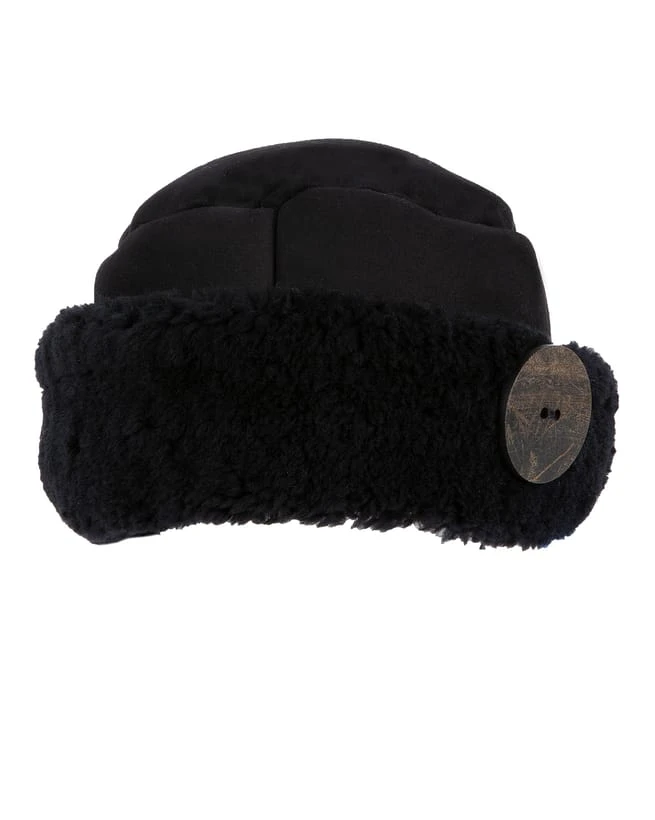 Give your wrapped-up wardrobe a modern overhaul with this super-soft hat. Made in Cornwall from 100% shearling, this timeless style features a fluffy cuff around the face and is finished with a large button trim as a contemporary signoff.