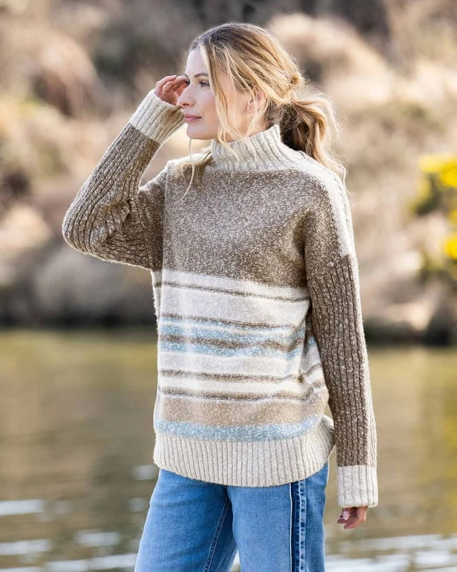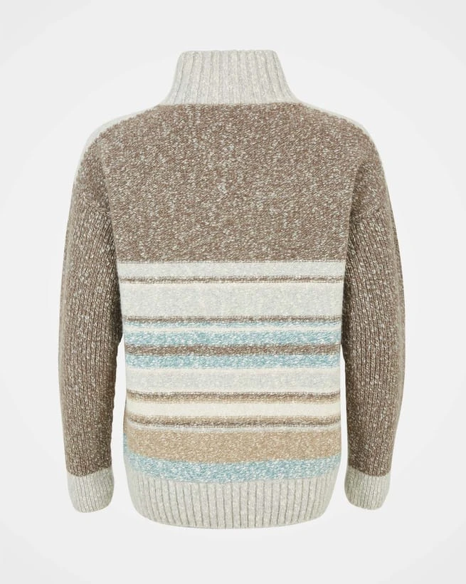 In a colour palette inspired by the Cornish coastline, this luxurious sweater is awash with details that lift it firmly out of the ordinary. It’s knitted in soft Geelong wool that’s been spun using twists of different yarn ends. The result is a slubby, texturally rich finish that’s enhanced by the combination of variegated stripes, colour blocking and chunky ribs at the collar, sleeves and hem.