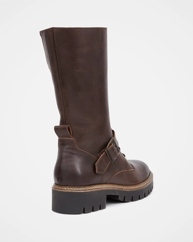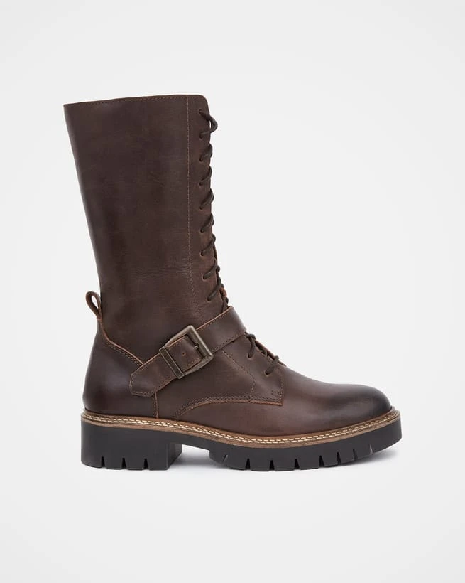 Comfortable and stylish, our tall lace up boot is a chic new take on our best selling styles. Made from rich rustic leather with hand finished burnishing and fully lined in vegetable tanned leather, these mid-calf length lace up boots are great for winter and beyond. Featuring a chunky recycled rubber cleated sole with deep leather welt to give a trendy edge to your wardrobe. Details include a buckle and strap across the top of the boot, plus an ankle pull tab and full length zip on the inner side for ease of wear.