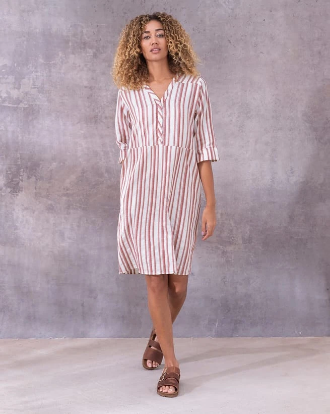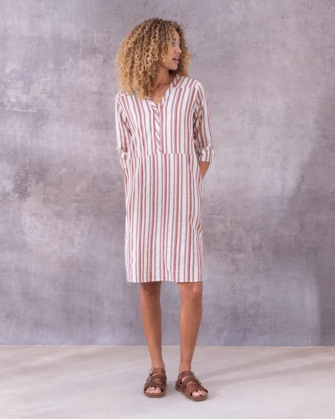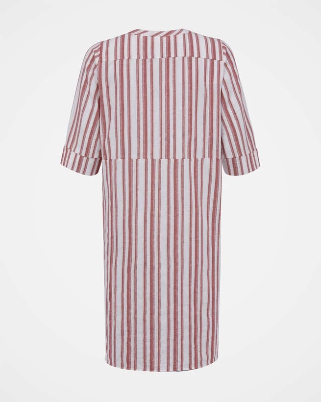 This Striped Knee Length Dress has a flattering straight fit for a relaxed, casual look. The textured cotton stripe fabric is breathable and airy, whilst the 3/4 length sleeves offer a bit more coverage whilst still keeping you cool. This loose fitting style features cutabout, split cuff stripe detail, a v-neckline, side pockets and a button down bodice.