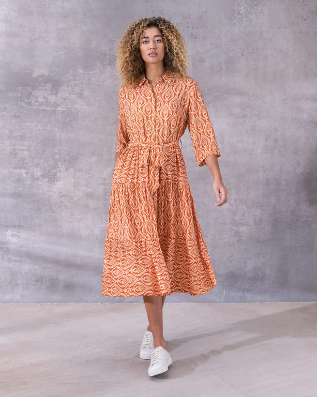 A midi length, button through shirt dress in a bright, fun print that is easy to dress up and down. Featuring a classic collar, half-length sleeves, side pockets and a self-tie belt. The skirts fabric is gathered into tiered seams providing a flowing, full skirt, coupled with a neat top section. Go from day to night by switching sneakers for wedges.
