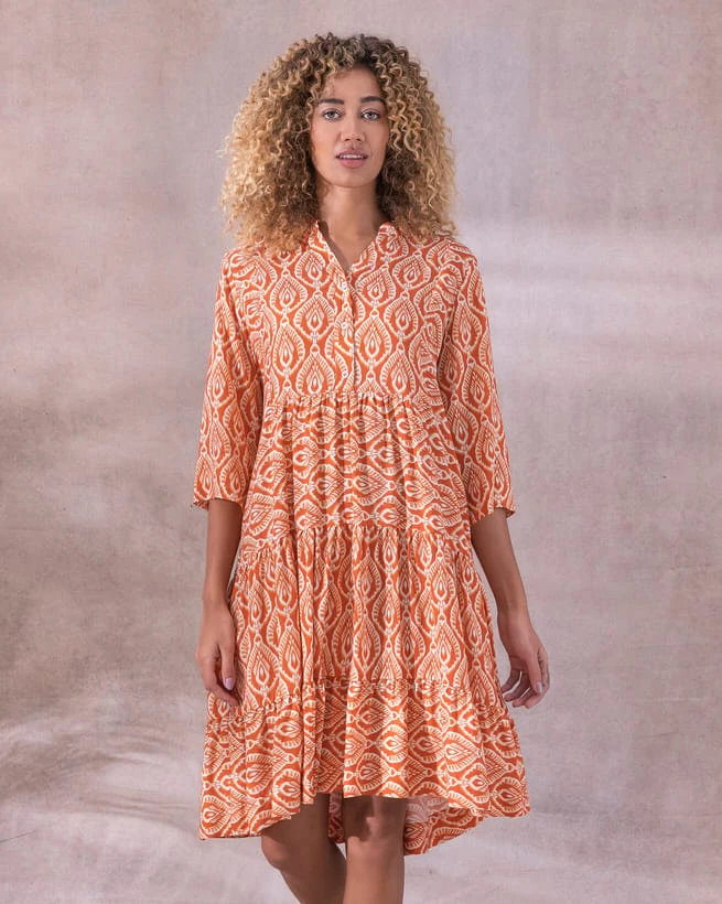 With its slightly oversized and floaty fit, this Knee Length Swing Dress is perfect for summer. Featuring gathering into tiered seams, the dress has lots of floaty volume, allowing it to be dressed up or down easily. Made in a bright and fun print, the upper section of the dress has a small stand collar and button through half placket detail on the front yoke.