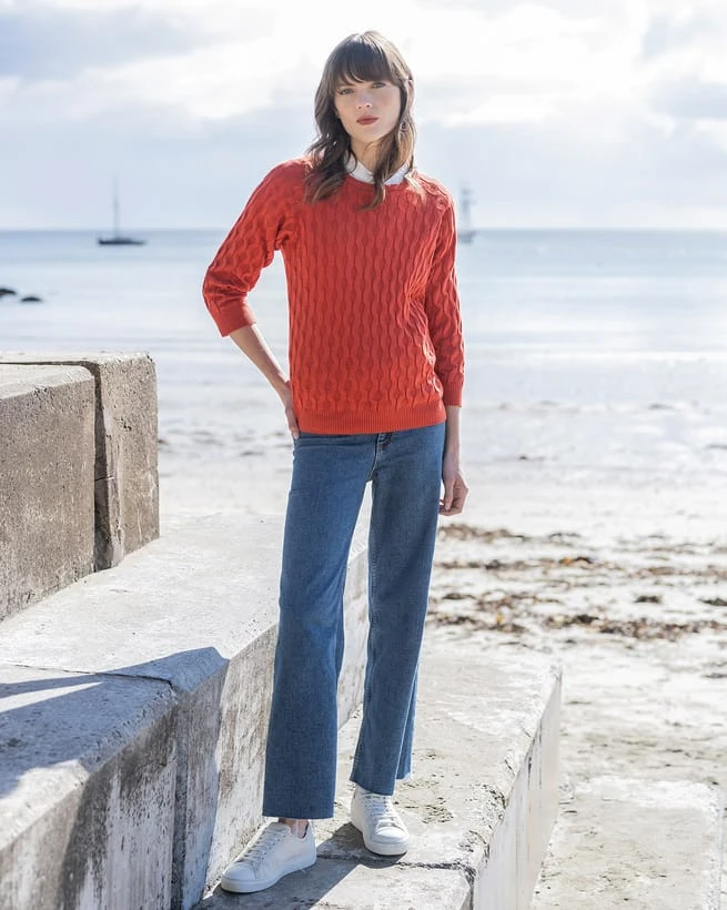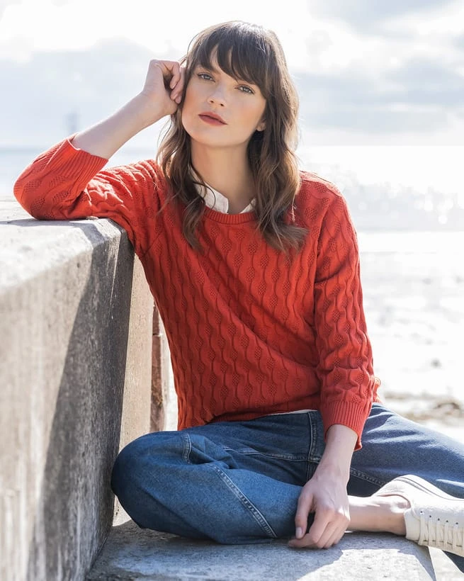 Our Wave Pointelle Sweatshirt features a crew neckline, raglan sleeves and pointelle stitching throughout the fabric which adds a beautiful feminine twist to a classic piece. It’s a great summery layer, which pairs well with our oatmeal Slim Leg Cotton Pants. Layer it over a shirt for colder evenings, or wear with shorts on breezy beach days.